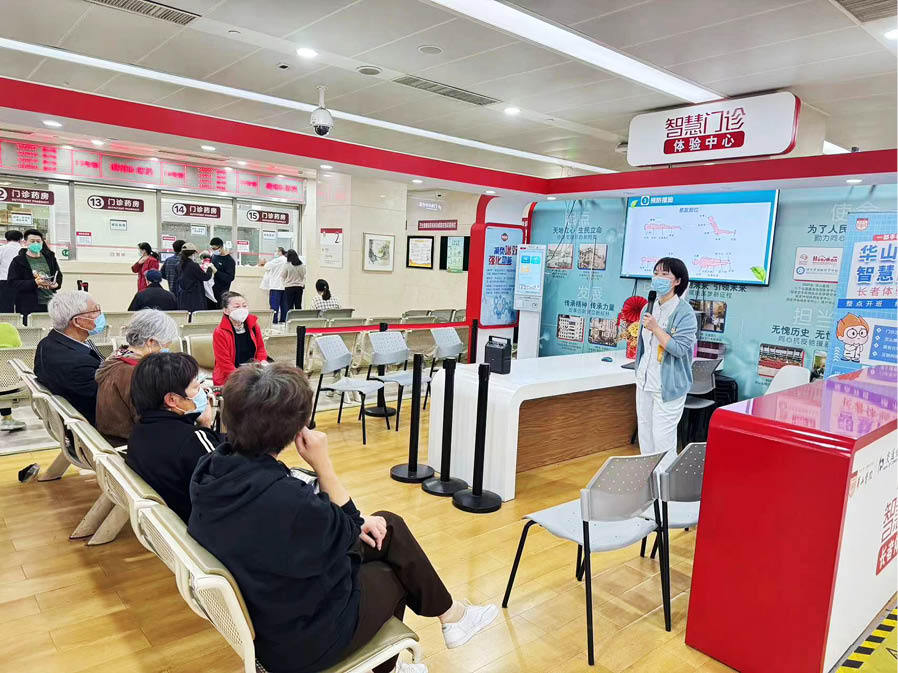 在推進(jìn)新技術(shù)應(yīng)用的同時(shí),華山醫(yī)院充分考慮到目前還不能熟練使用智能設(shè)備的老年患者。在華山醫(yī)院門診二樓,每天都有公益性的課程,志愿者手把手教患者熟悉醫(yī)院看病流程,幫助老年患者方便就醫(yī)。